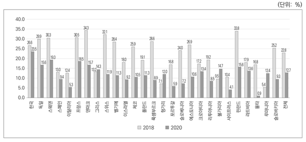 [그림 4]는 가족 또는 친구와 주 1회 미만의 상호작용을 하는 제한된 사교 집단의 변화를 분석한 결과이다. 앞에서 제시한 은둔, 사회적 고립 집단을 제외하고 분석하였다. 우리나라는 2018년 기준 제한된 사교 집단이 12.7%로 다른 유럽 국가에 비해 높은 수준을 나타냈으며, 2020년 14.9%로 소폭(2.2% 포인트) 증가하였다. 반면 우리나라를 제외한 나머지 유럽 국가에서는 제한된 사교 집단이 평균 5.1% 포인트 증가하였다. 유럽 국가 중 제한된 사교 집단의 증가 폭이 높았던 국가들은 사이프러스(11% 포인트 증가), 덴마크(10.3% 포인트 증가), 핀란드(6.3% 포인트 증가), 폴란드(6.1% 포인트 증가)였다.