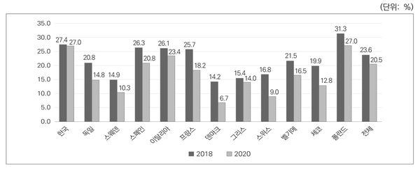 [그림 5]는 가족 및 친구 모두와 친교 활동이 자주 이루어지는 사교적 관계 집단의 변화를 분석한 결과이다. 우리나라의 경우 2018년은 26.6%, 2020년은 23.5%로 3.1% 포인트 감소하였으나 유럽 국가들에 비해 감소 폭은 상대적으로 작은 편이었다. 유럽 국가들의 사교적 관계 집단 감소 폭은 스위스가 20.2% 포인트로 가장 컸으며 룩셈부르크(19.7% 포인트), 핀란드(18.2% 포인트), 덴마크(17.6% 포인트) 순으로 나타났다. 이들 국가의 노인들은 대체로 코로나19 이전 고령층의 사회관계가 모두 활발했다. 이 외에 슬로베니아(16.8% 포인트), 에스토니아(16.3% 포인트), 몰타(15.9% 포인트), 슬로바키아(15.9% 포인트) 등 동유럽 국가들은 감소 폭이 비교적 컸다. 이상의 결과에서 보듯이 우리나라 노인들은 유럽 국가의 노인에 비해 사회적 관계의 변화가 비교적 적은 편이었다. 비록 주 1회 미만 연락하거나 만나는 제한된 사교 집단의 비율이 소폭 늘어났으나 은둔 및 고립 상태의 노인 비율이 적고, 사회적 관계를 활발히 가지는 집단의 변화 역시 적었다.