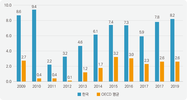 한국은 OECD 국가 중 의료비 증가율이 가장 높다(OECD, 2021a). [그림 1]은 한국과 OECD 국가의 과거 10년간 실질 의료비 증가율 추이를 보여주는데, 한국의 의료비 증가율이 OECD 평균에 비해 낮은 적이 없으며, 과거 10년 동안 한국의 실질 의료비 증가율은 6.4%로 OECD의 1.8%에 비해 무려 3.5배가 높다.
