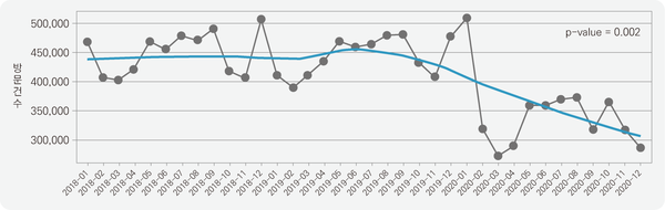 시간 경과에 따라 응급실 방문건수 변화는 선형적 증가 또는 감소 추세 이외에도 다양한 추세가 나올 것으로 기대하여 비모수적 국소회귀 분석을 수행하였다. 2018년 1월부터 2020년 12월까지 월별 응급실 방문건수는 통계적으로 유의하게 감소하였으며(p=0.002), 2019년까지는 큰 변화가 없었고 2020년부터 선형적 감소 추세를 보였다(그림 1).