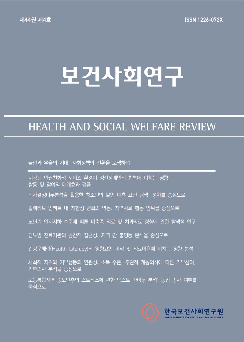 본 연구는 Andersen의 의료서비스 이용 모델과 Levesque의 의료서비스 접근성 모델을 기반으로 노년기 주관적 인지저하 수준에 따른 미충족 의료(치과의료) 경험 여부와 그 이유를 탐색하고자 하였다. 이를 위해 본 연구에서는 전국 단위 국가 조사인 「지역사회건강조사」 자료를 이용하여 만 60세 이상 노인의 미충족 의료(치과의료) 경험 여부와 그 이유를 가중적용 로지스틱 및 다항 로지스틱 회귀모형을 이용하여 분석하였다. 분석 결과 비인지저하 노인 대비 주관적 인지저하 노인과 일상생활 어려움 동반 인지저하 노인은 미충족 의료(치과의료)를 경험할 확률이 유의미하게 높게 나타났으며, 인지저하 노인의 경우 경제적(비용적) 이유와 교통·이동의 제한으로 필요한 의료(치과의료) 서비스를 받지 못했다고 응답할 확률이 상대적으로 높게 나타났다. 이러한 연구 결과를 바탕으로 인지저하 노인의 미충족 의료(치과의료) 경험을 예방하고, 적절한 의료서비스 이용과 접근성을 제고하기 위한 정책 및 서비스 방안을 제시하였다.