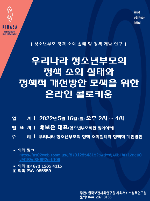한국보건사회연구원은 오는 5월 16일(월) 오후 2시에 '청소년부모 정책 소외 실태 및 정책 개발' 연구에 관한 온라인 콜로키움을 개최합니다.