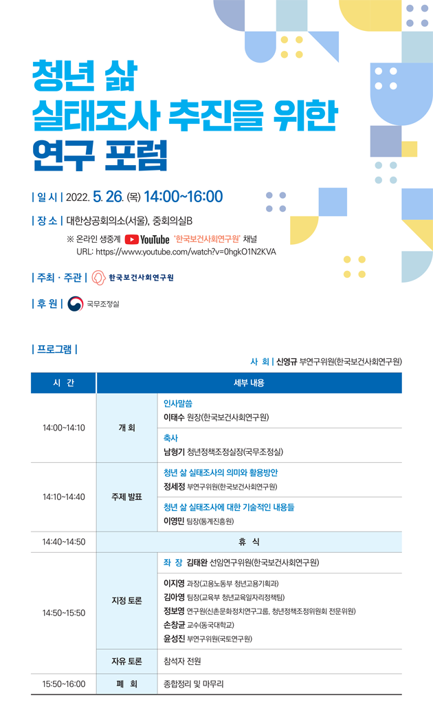 - 장소: 유튜브 한국보건사회연구원 채널을 통한 실시간 중계