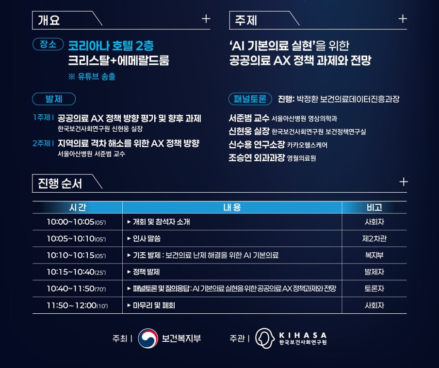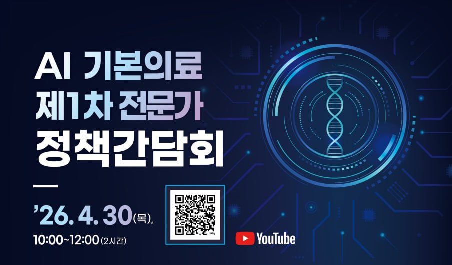 ‘AI 기본의료 실현’을 위한 공공의료 AX 정책 과제와 전망을 공유하고, 보건의료 난제 해결을 위한 디지털 전환(AX)의 구체적인 정책 방향 및 향후 과제 논의하는 인공지능(AI) 기본의료 제1차 전문가 정책간담회를 개최합니다.