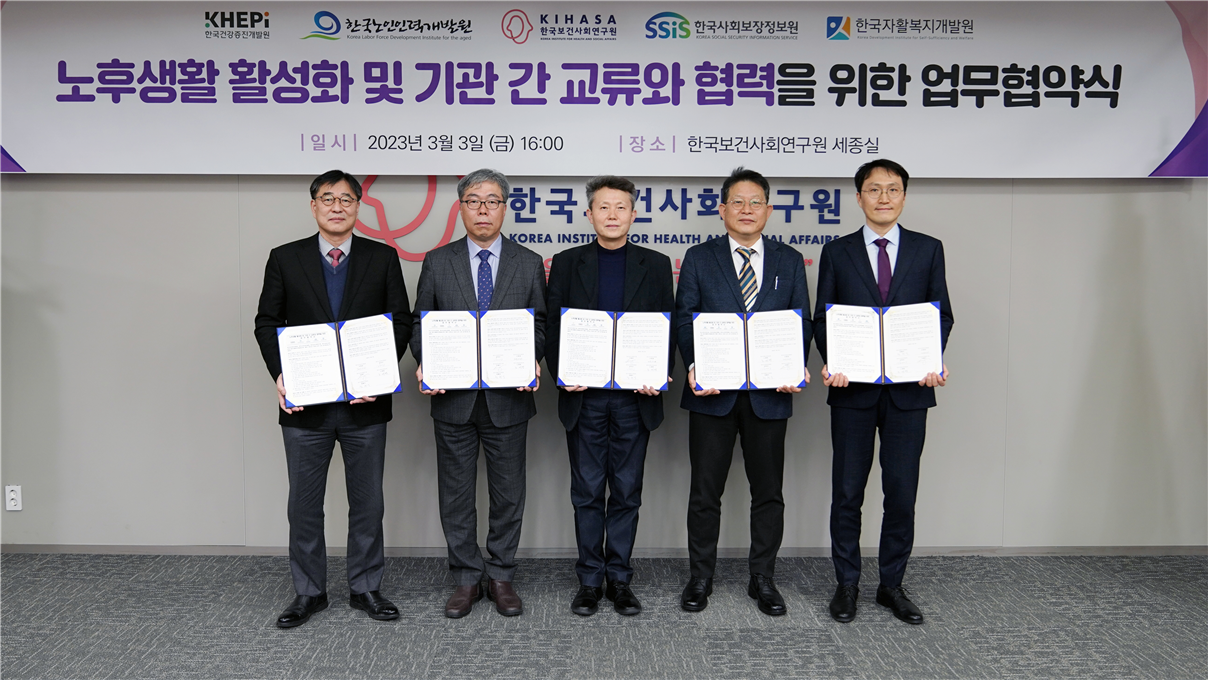 □ 한국보건사회연구원과 한국건강증진개발원, 한국노인인력개발원, 한국사회보장정보원, 한국자활복지개발원 5개 기관은 3월 3일(금) 오후 4시 한국보건사회연구원 세종실에서 ‘노후생활 활성화’를 위한 다자간 업무협약을 체결했다고 밝혔다.