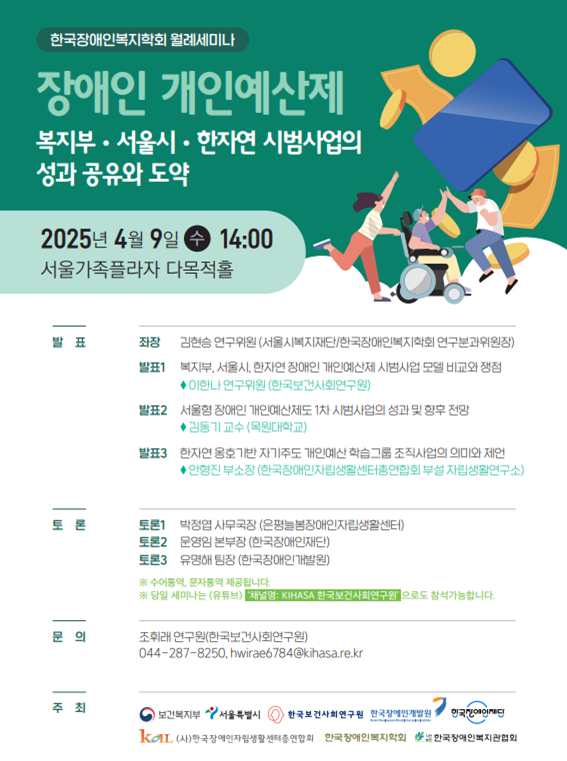 □ 한국보건사회연구원(원장 신영석, 이하 보사연)은 4월 9일(수) 오후 2시부터 5시까지 서울가족플라자 다목적실에서 『장애인 개인예산제: 복지부, 서울시, 한자연 시범사업의 성과 공유와 도약』을 주제로 세미나를 개최한다.