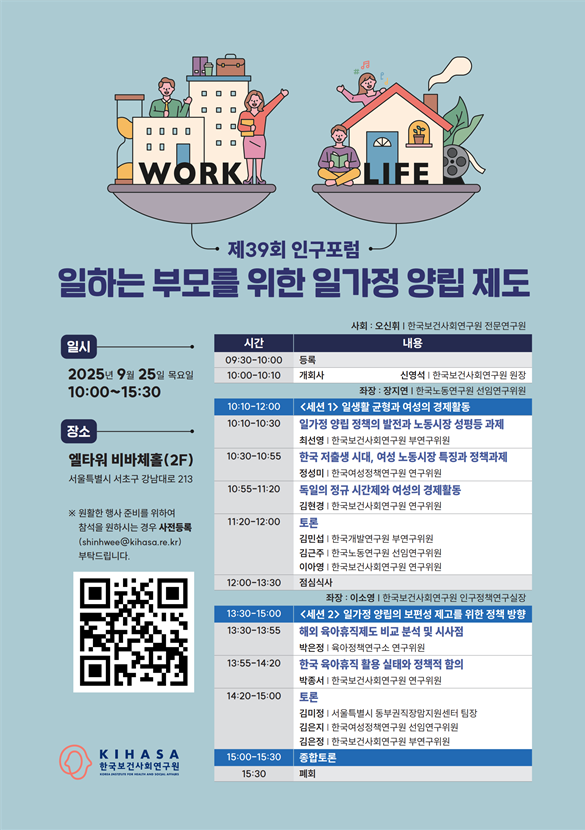 “일하는 부모를 위한 일가정 양립 제도” 보사연, 제39회 인구포럼 개최 - 9월 25일(목) 오전 10시부터 서울 양재 엘타워 비바체홀에서 개최 - ‘일생활 균형과 여성의 경제활동’에 이어 ‘일가정 양립의 보편성 제고를 위한 정책 방향’에 대해 총 4개의 주제 발표와 토론 진행 - 신영석 원장 “일과 돌봄을 조화롭게 병행할 수 있는 사회적·제도적 기반 마련은 매우 중요… 해외 사례와 비교 연구, 현장의 목소리를 통해 일가정 양립제도의 발전 가능성 모색할 것” |