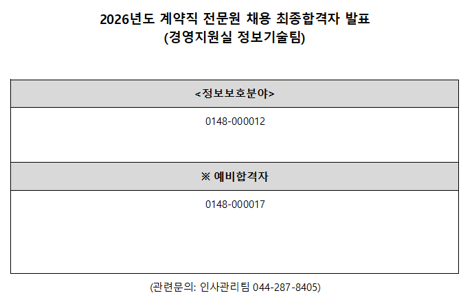 2026년도 계약직 전문원 채용 최종합격자 발표(경영지원실 정보기술팀)