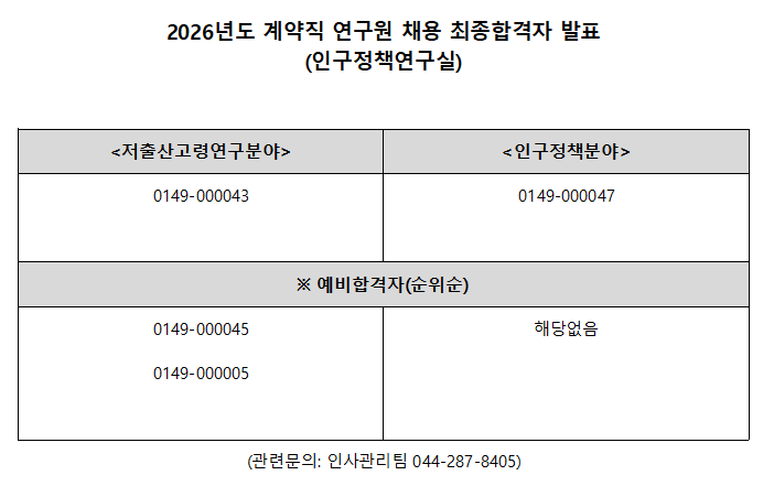 2026년도 계약직 연구원 채용 최종합격자 발표(인구정책연구실)