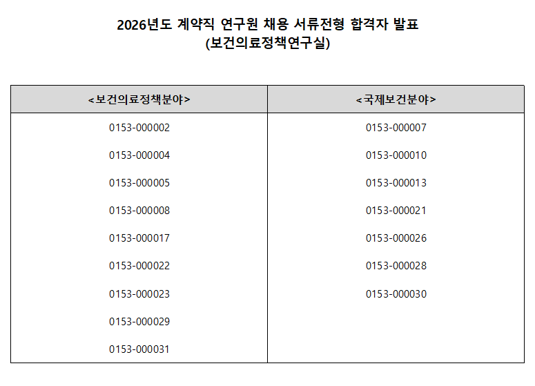 2026년도 계약직 연구원 채용 서류전형 결과 발표(보건의료정책연구실)