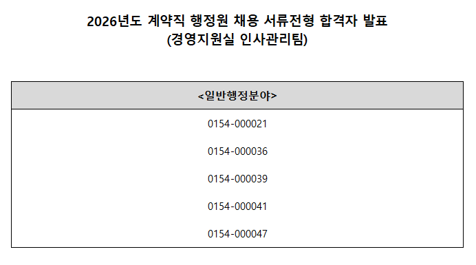 2026년도 계약직 행정원 채용 서류전형 결과 발표(경영지원실 인사관리팀)